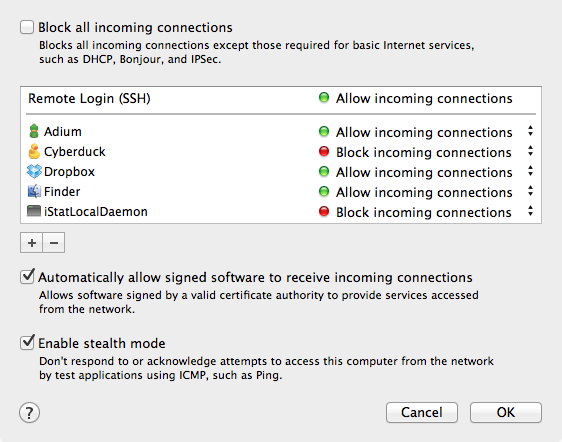 Most Apple Mac OS X users are familiar with the application level firewall. Each application that opens a network socket to accept an incoming connection needs explicit user permission. You may have seen a firewall dialog box when starting applications for the first time that asks you if you want to allow an application to access the network. This service and is managed through the Firewall tab in the Security & Privacy section of System Preferences.