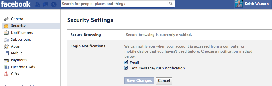 Select the methods by which you will be notified when your account logs into Facebook (email and text message) and click the “Save Changes” button.